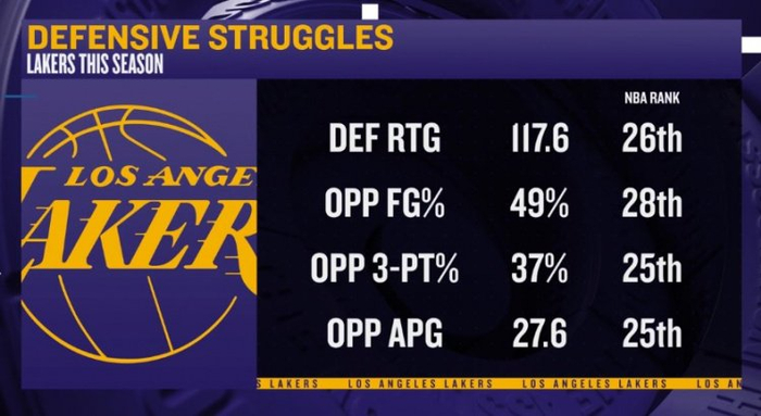 今日,ESPN总结了湖人本赛季至今糟糕的防守数据: